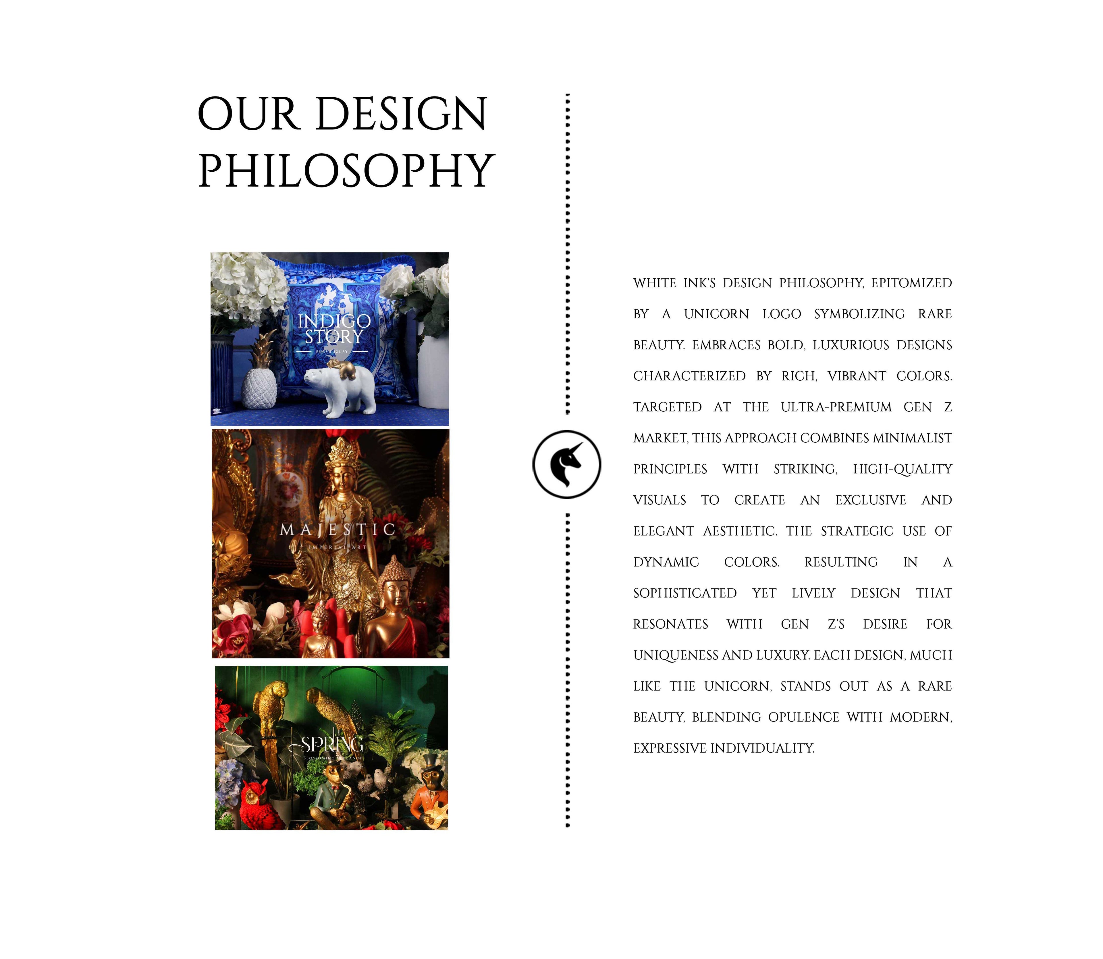 WHITE INK AIMS TO BE A TRENDSETTER WITH A UNIQUE, PURPOSEFUL DESIGN APPROACH THAT CREATES MEANINGFUL IMPACT IN CONSUMERS' LIVES. BY INFUSING BEAUTY AND SOPHISTICATION INTO EVERY OBJECT, WHITE INK ENSURES THAT EACH DESIGN IS NOT ONLY VISUALLY STRIKING BUT ALSO ENHANCES DAILY LIVING. THEIR PHILOSOPHY HOLDS THAT IF AN OBJECT ISN'T BEAUTIFUL, IT WON'T BE CHERISHED OR KEPT IN THE HOME. THROUGH THIS COMMITMENT TO ELEGANCE AND PRACTICALITY, WHITE INK CRAFTS DESIGNS THAT SEAMLESSLY INTEGRATE INTO AND ELEVATE THE AES-THETICS OF EVERYDAY ENVIRONMENTS, SETTING NEW TRENDS AND REDEFINING MODERN LUXURY.